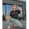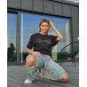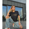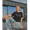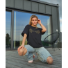 Modernūs juodos spalvos laisvalaikio marškinėliai trumpomis rankovėmis - puikus pasirinkimas tiek vyrams, tiek moterims, kurie vertina stilių ir komfortą. Šie marškinėliai papuošti auksinės spalvos spauda ant krūtinės, kuri suteikia subtilų ir elegantišką akcentą.